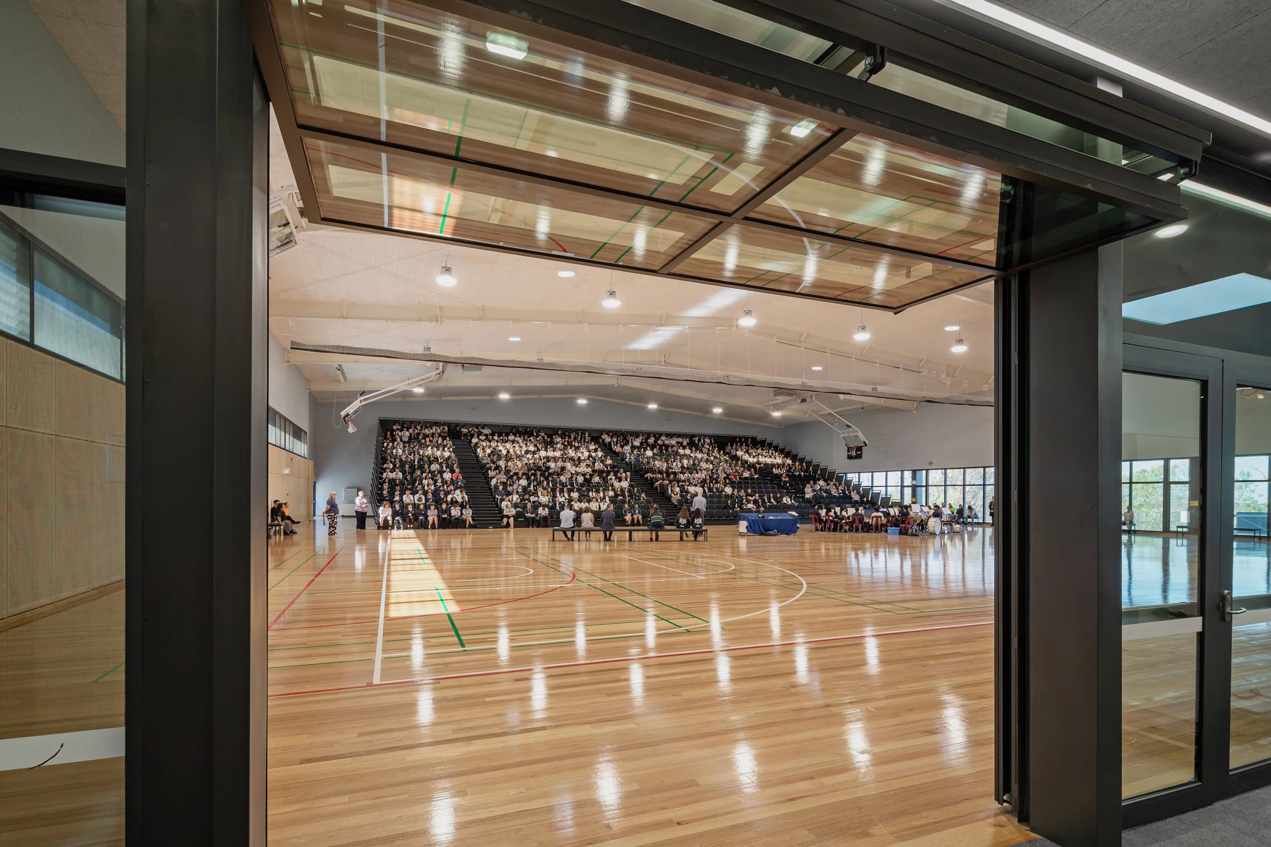 The school has in the recent past, with the current and consistent leadership team, been adapting and developing the existing building stock to meet their needs. The LTCs and 1990’s school buildings present significant physical limitations in this endeavour. The existing gymnasium was the most salient case in point. The school did not have an indoor space that could accommodate the 1600 plus student population. The existing single court gymnasium did not meet current court standards and was not fit for purpose. The new dual court gymnasium has allowed the school to deliver their sports and PE curriculum and also provides the large indoor gathering space they were lacking. The inclusion of retractable seating has provided a multi function space for both large assemblies as well as sports court viewing.